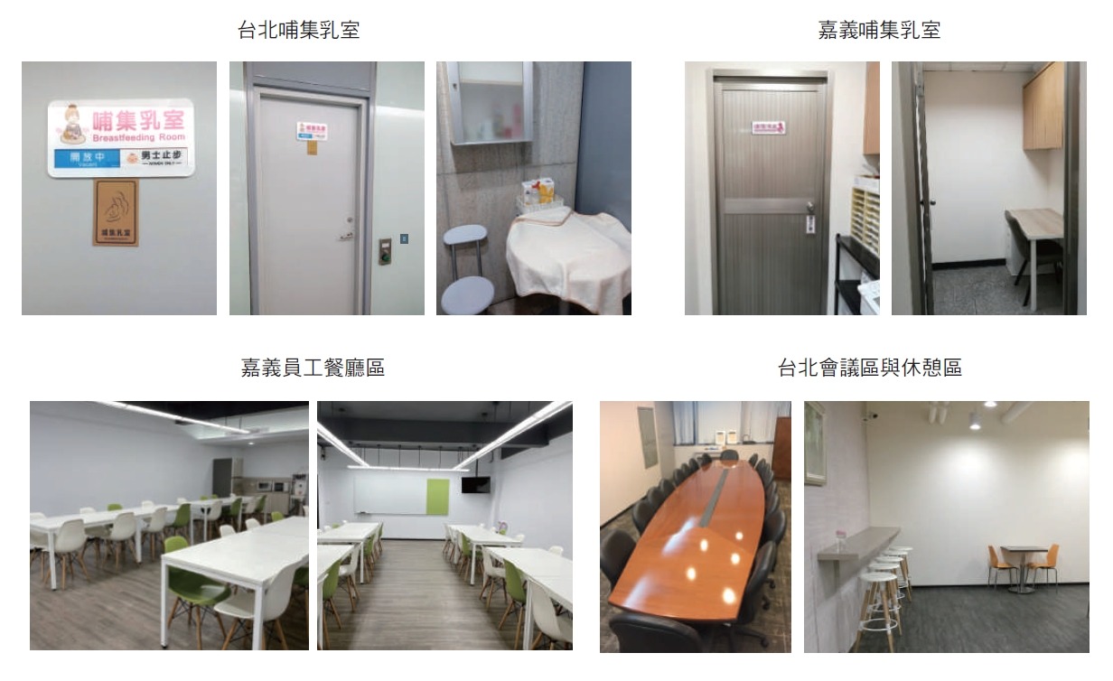 為提升員工工作效率,公司提供明亮舒適的工作環境、休憩區及員工餐廳;各營業地點皆為女性員工貼心設置獨立隱私的哺集乳室,供有需求的媽媽們使用。